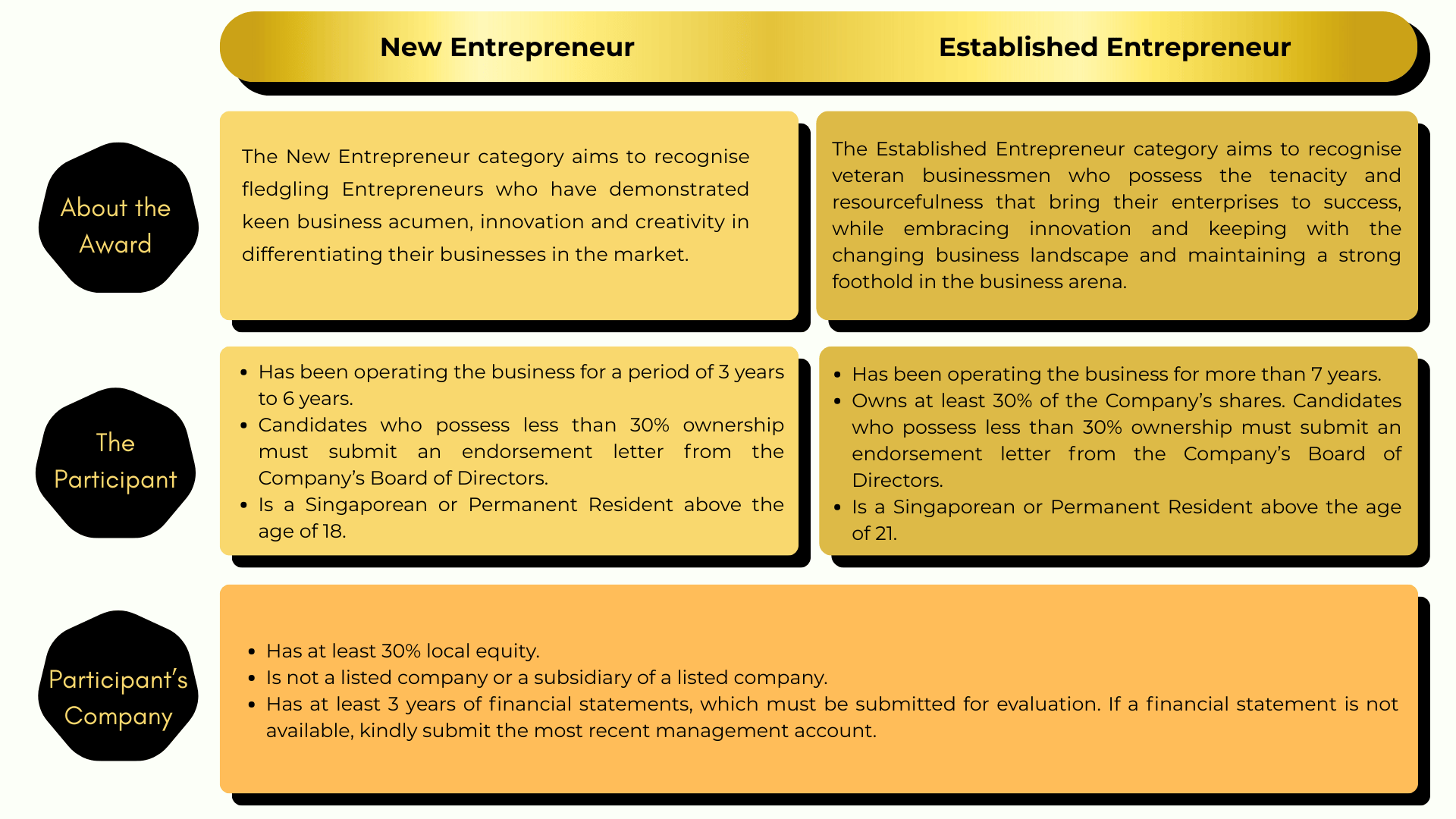 * Award Package for the New Entrepreneur and Established Entrepreneur category is S$9,888 and S$19,888 (inclusive of prevailing GST) respectively.